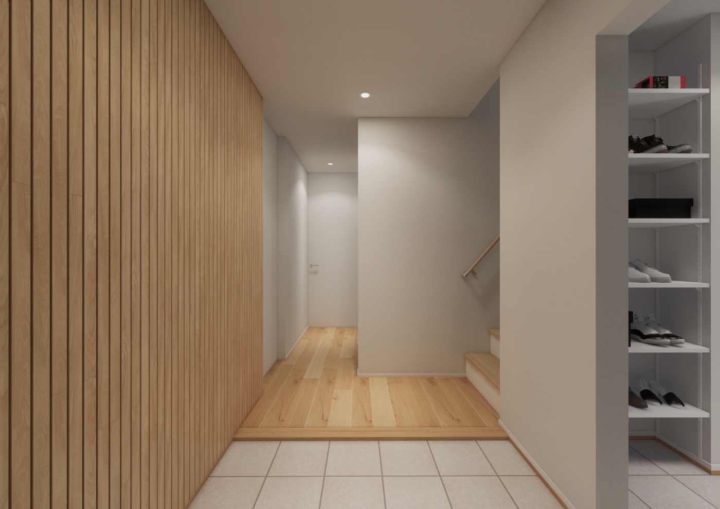 和の落ち着きと北欧のナチュラルな心地のよさ組み合わせた新しいテイストの家 深みのあるブラウンの外壁に木の温もりを添えた落ち着きのある外観です。 室内はナラ樫の床と白の建具を基調に、塗装調やオークの板張り、タイルの質感を重ね、柔らかな色合いが自然素材の良さを引き立てる空間に。 スキップフロアの小上がりやロフトとつながる吹抜けリビングは、遊び心と立体的な広がりを感じさせます。広々SICやWICなど収納面も充実しており、飽きのこない上質さと暮らしやすさの工夫が詰まった家になっています。