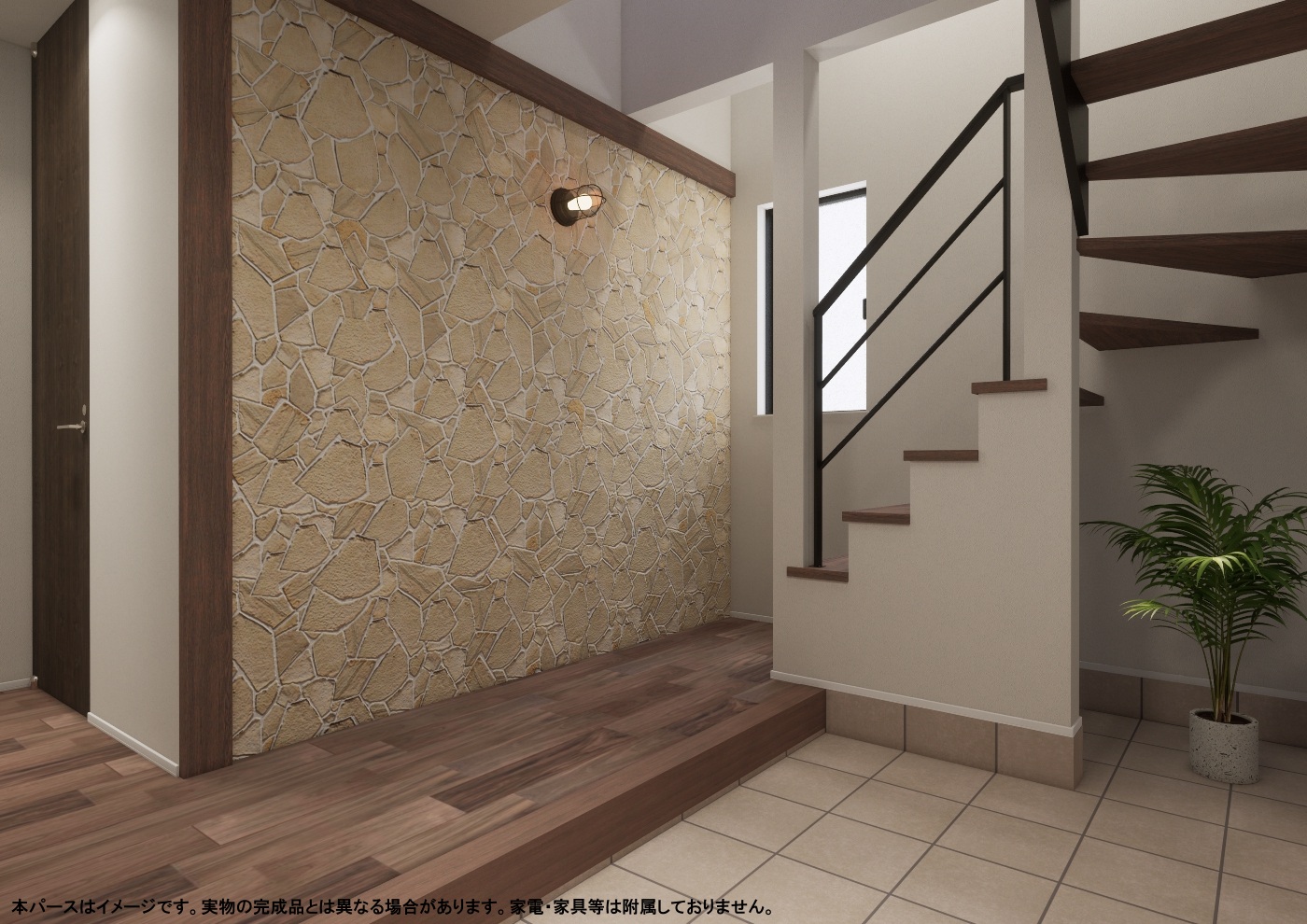 綿や麻のようなあたたかみのある表情を持つ織物調クロスと自然石の乱張りやウォルナット塗装を施した羽目板を組み合わせ、 落ち着きのある日々の暮らしにリゾート風な非日常感を味わえる空間としました。