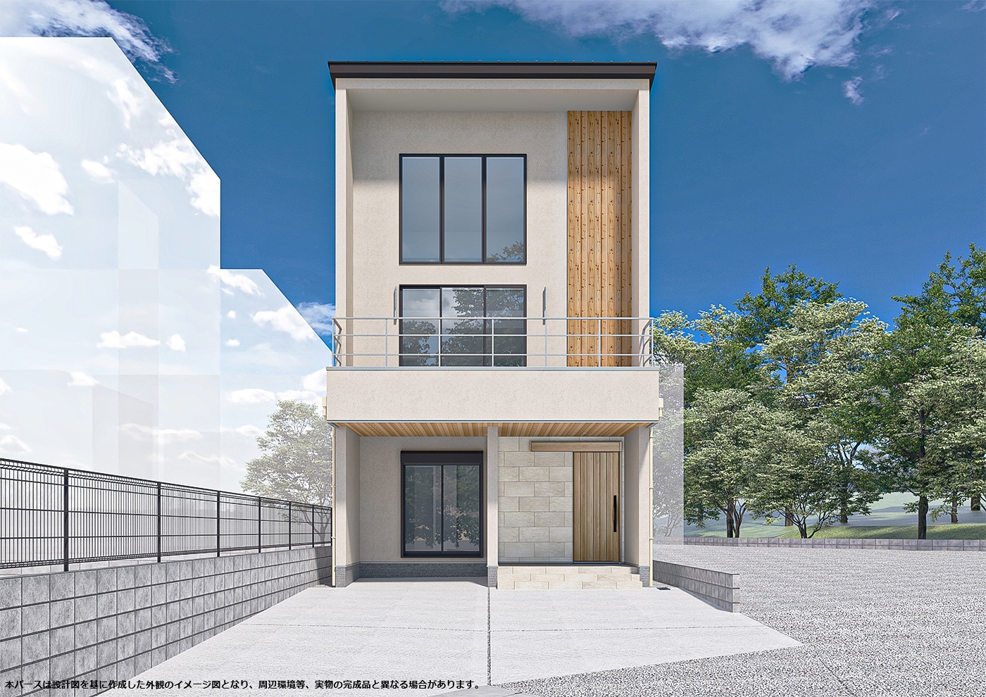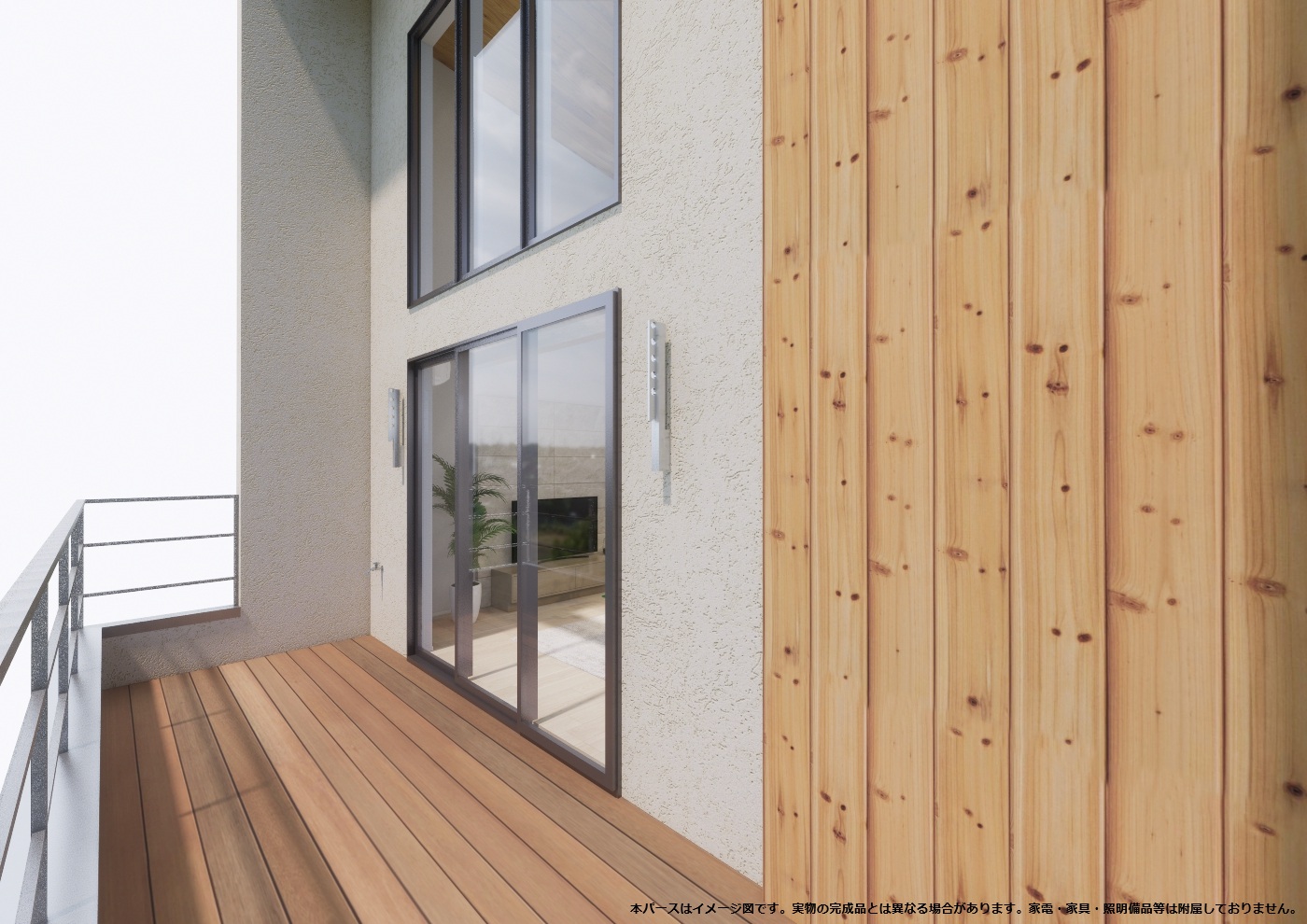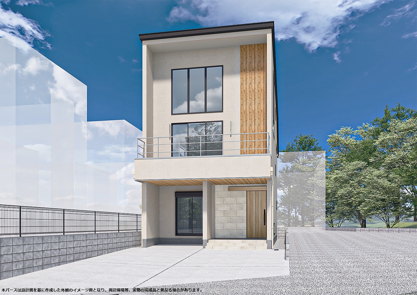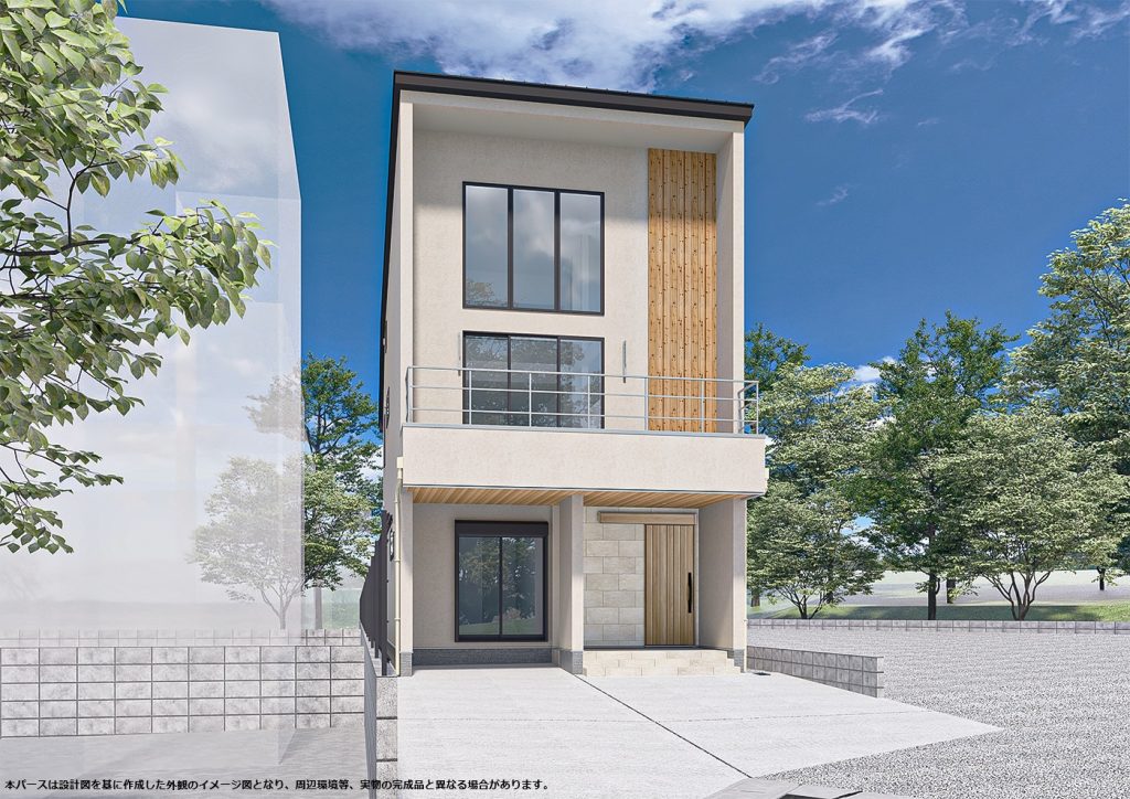 外壁は落ち着いた塗り壁とし、自然豊かな外部と調和するように計画しました。 またリビング・吹抜けに連窓とした開口部から借景を存分に楽しめます。