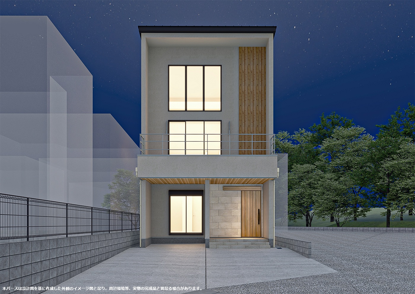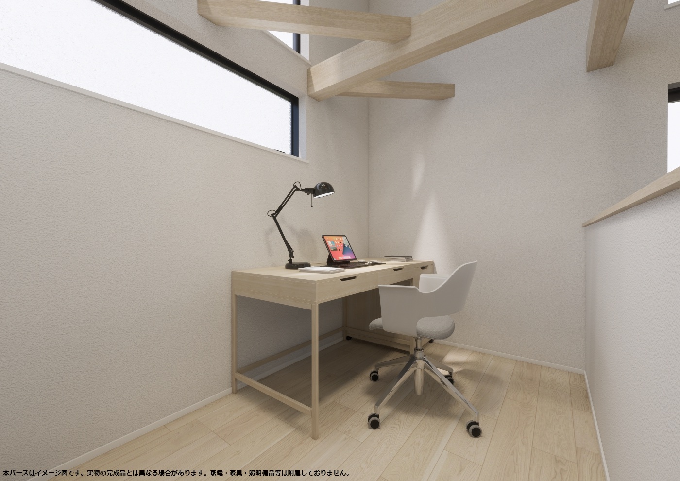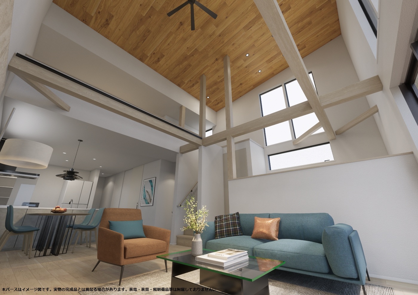 外壁は落ち着いた塗り壁とし、自然豊かな外部と調和するように計画しました。 またリビング・吹抜けに連窓とした開口部から借景を存分に楽しめます。